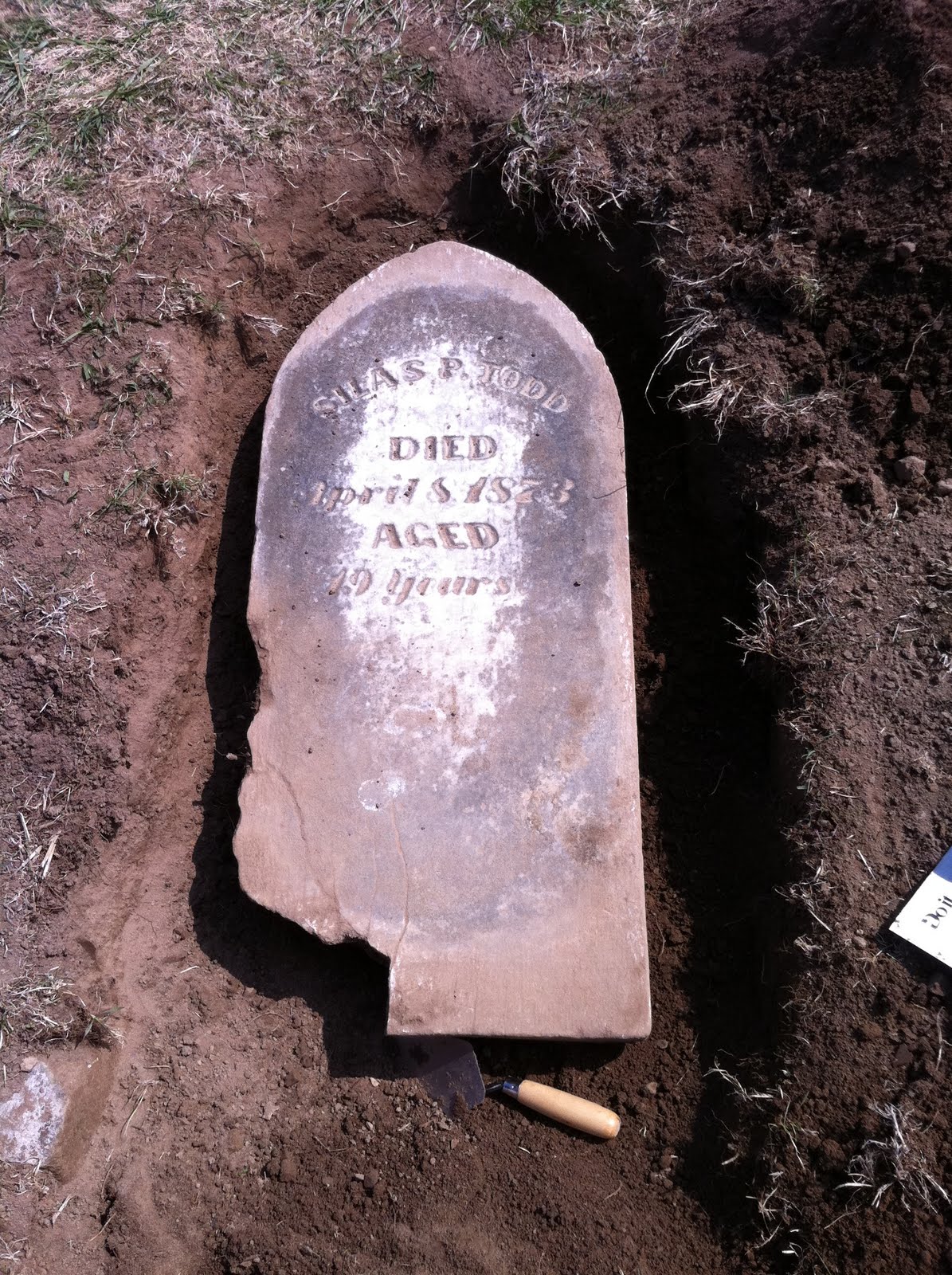 He was only 19 years old.  We found the pieces of the broken marker, and we are in the process of cleaning and numbers the piece; so that they can be piece together like a puzzle,  The epoxied to the cleaned stone prior to remounting